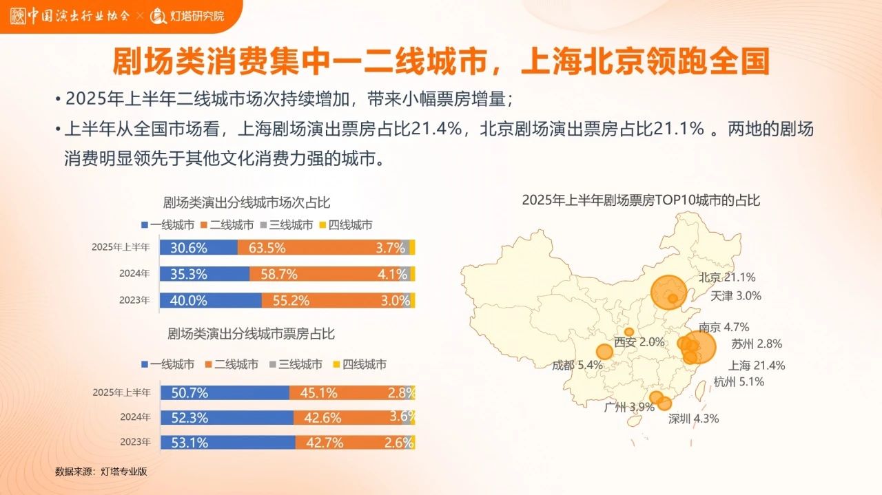 从地域上看,2025年上半年剧场类消费仍集中在一二线城市,其中上海票房占比21.4%领跑全国,北京票房占比21.1%紧随其后,两地剧场消费明显领先于其他文化消费力强的城市。