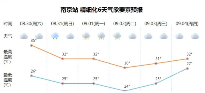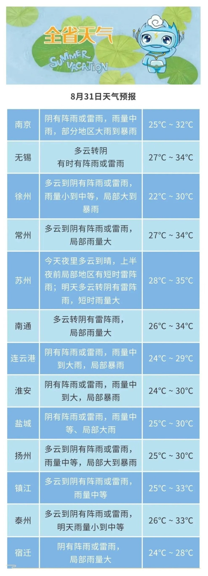 江苏东南部地区多云,午后有分散性雷阵雨;其他地区多云到阴有阵雨或雷雨,雨量中等,局部大到暴雨。最高温度:江苏东南部地区35℃左右,沿淮和淮北地区30℃左右,其他地区32~33℃;最低温度:沿淮和淮北地区24℃左右,其他地区26~27℃。淮北地区偏西风,其他地区偏南风转偏西风,风力都是4级左右,有雷雨地区雷雨时短时阵风7-9级。