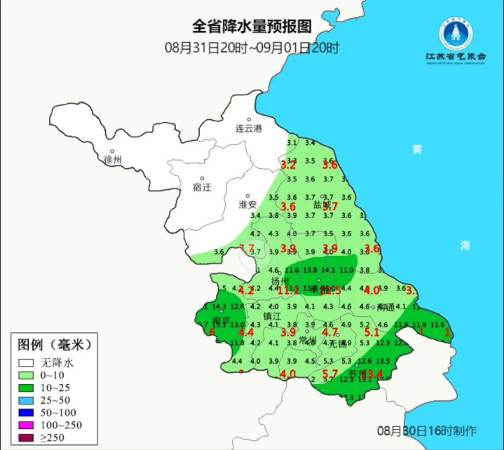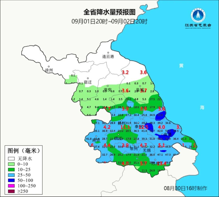 预计今年9月降水量淮北中东部和东南沿海地区较常年偏多0~2成,其他大部地区接近常年同期。全省范围内有4次降水过程,出现时间为:9月上旬中后期、9月中旬前期、9月中旬中后期和9月下旬中期。