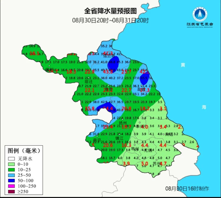 淮河以南地区阴有阵雨或雷雨,其中沿江和苏南地区中到大雨,局部暴雨;其他地区多云。最高温度:江苏西北部地区31~32℃,其他地区30℃左右;最低温度:淮北地区21~22℃,其他地区24℃左右。全省偏东风4级左右。