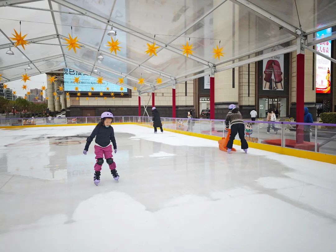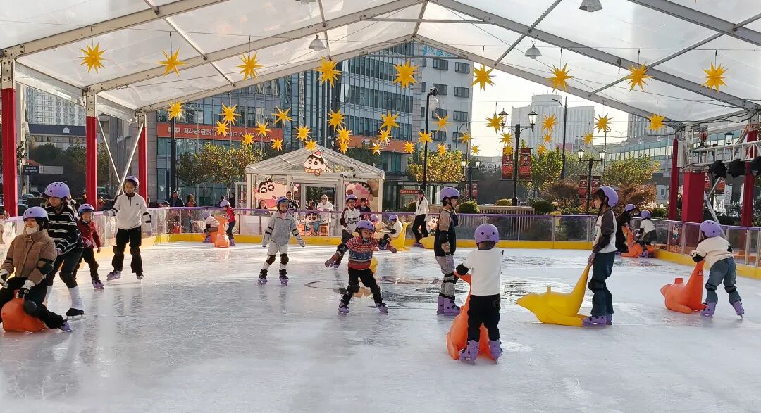 在环球港南广场,一座占地约400平方米的户外真冰滑冰场正式开放。冰场采用专业制冷设备,冰面光滑如镜,配套设施完善,四周的防风围挡采用半透明亚克力材质,而环绕冰场四周及上方的星星灯光,也让冰场浪漫气氛十足。