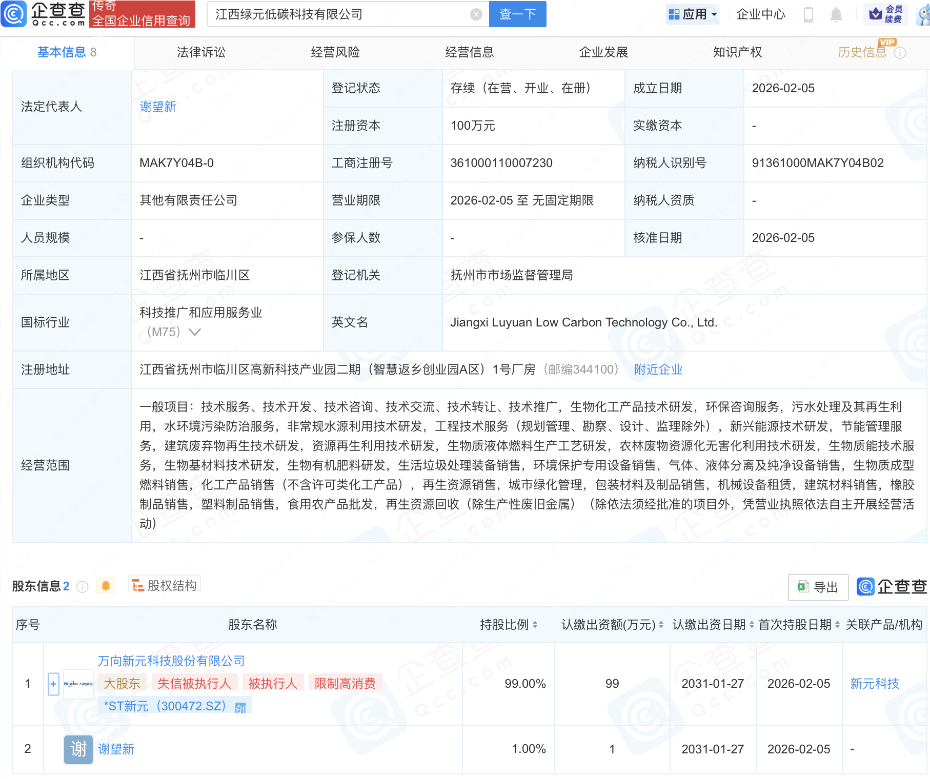 近日,江西绿元低碳科技有限公司成立,经营范围包含:生物质液体燃料生产工艺研发,农林废物资源化无害化利用技术研发,生物质能技术服务,生物基材料技术研发等。企查查股权穿透显示,该公司由*ST新元(300472)等共同持股。